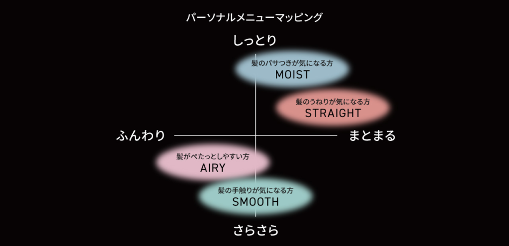 パーソナルメニュー4つ (MOIST / STRAIGHT / AIRY / SMOOTH)3つ (MOIST / STRAIGHT / AIRY)