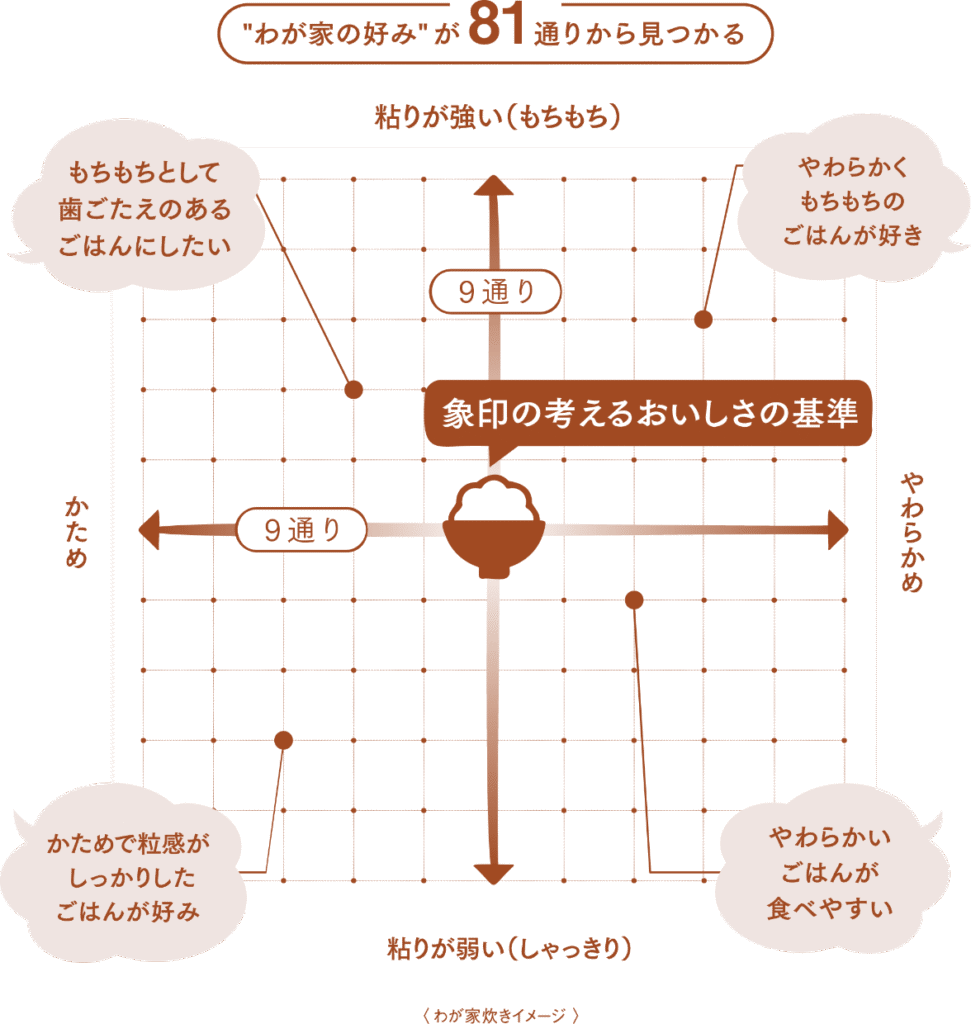 ✅ 白米:炊き分け5通り+わが家炊き81通りで、好みの食感に寄せられる!